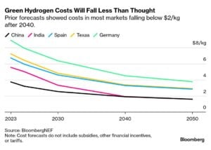 The U.S. also faces uncertainty about the Section 45V hydrogen tax credit. This credit offers up to $3 per kilogram for hydrogen produced with near-zero emissions. The credit helped close the gap between costly green hydrogen and cheaper fossil-based hydrogen. Without it, the cost of producing green hydrogen in the U.S. could rise from $3 to $5 per kilogram to over $7, according to BloombergNEF estimates.